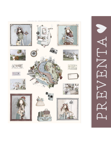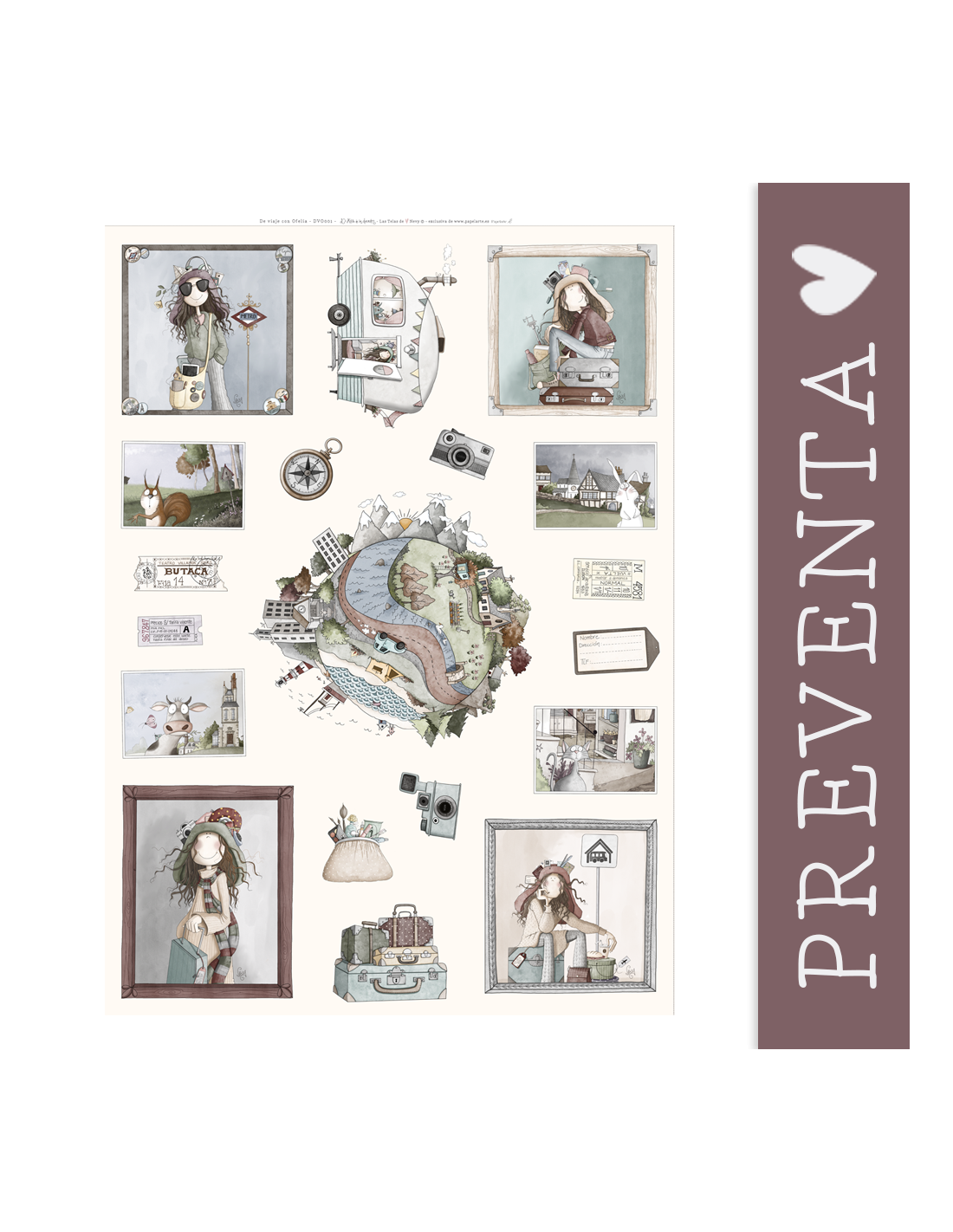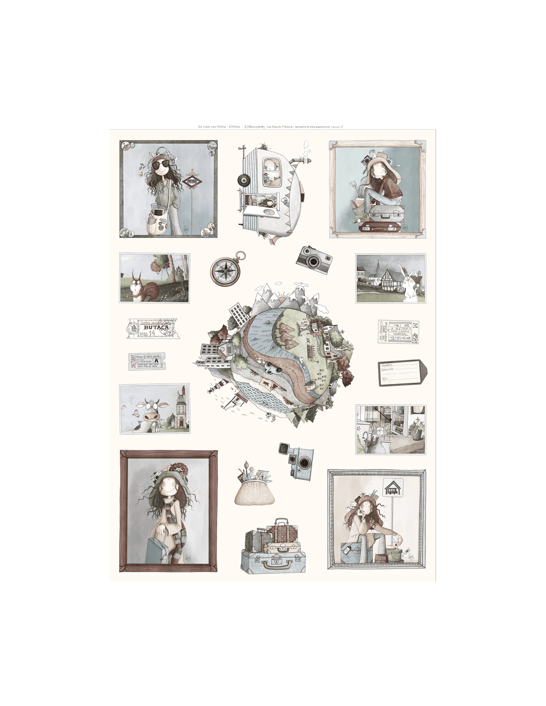 Panel con dibujos y elementos de la colección: De viaje con Ofelia, para que le des un toque mágicos a tus proyectos incluso estando de vacaciones.