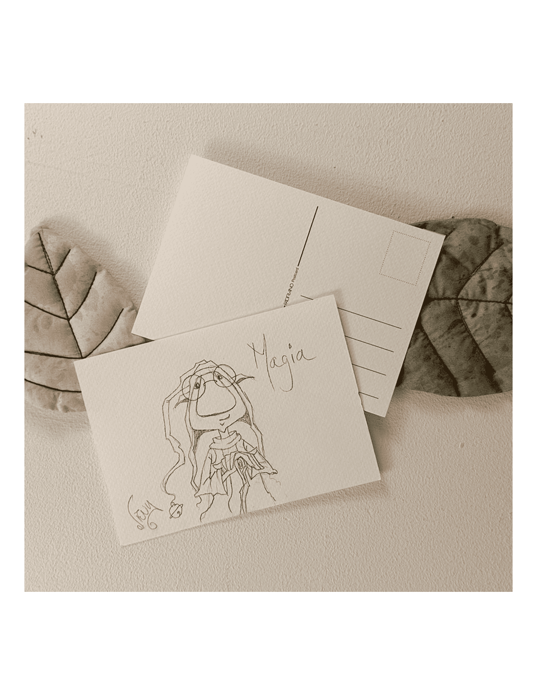 Postal con boceto original hecho a lápiz por Nevy, decora con su magia tu lugar favorito, ponlo en un rincón especial, o deja que llene de magia tu hogar.