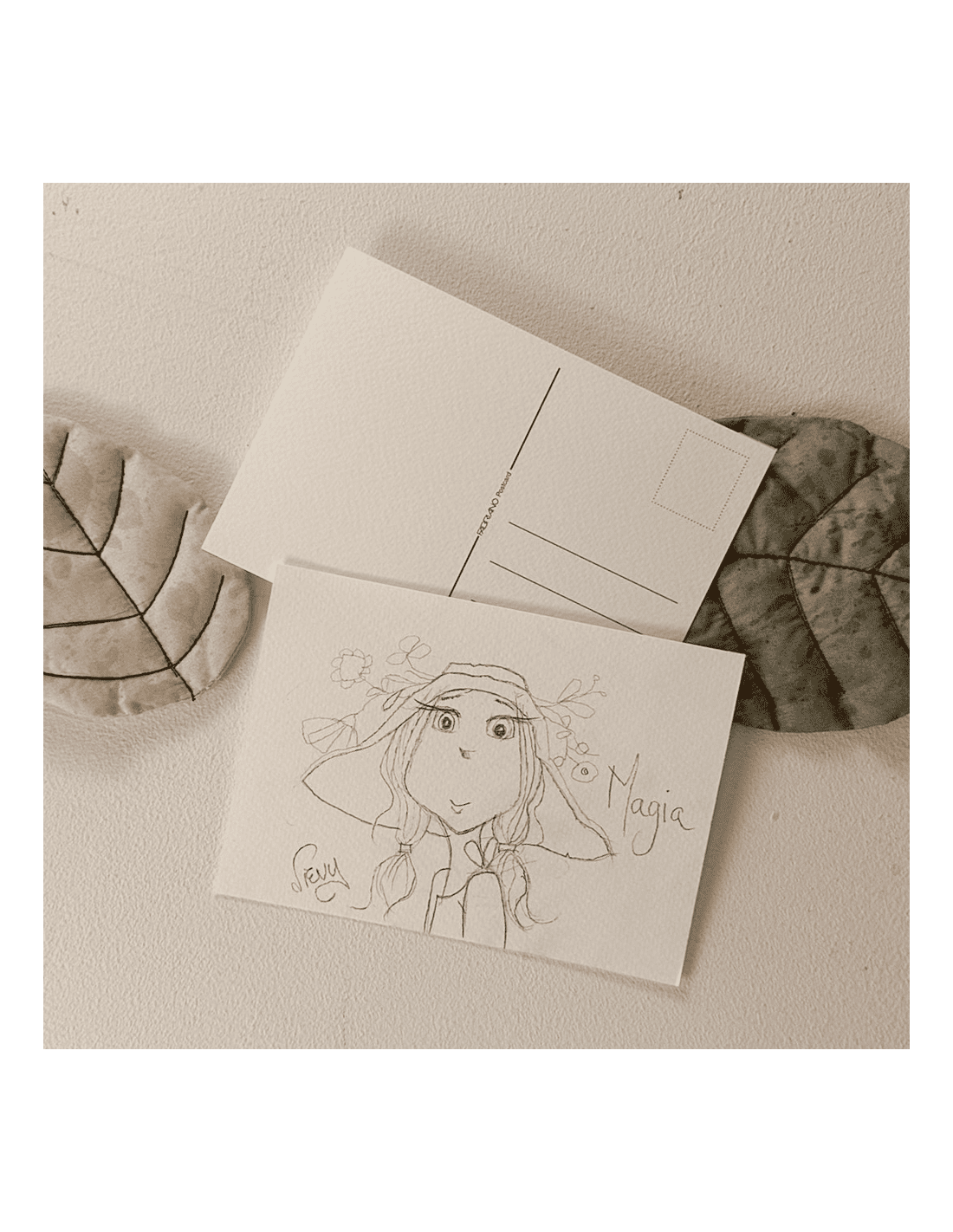 Postal con boceto original hecho a lápiz por Nevy, decora con su magia tu lugar favorito, ponlo en un rincón especial, o deja que llene de magia tu hogar.