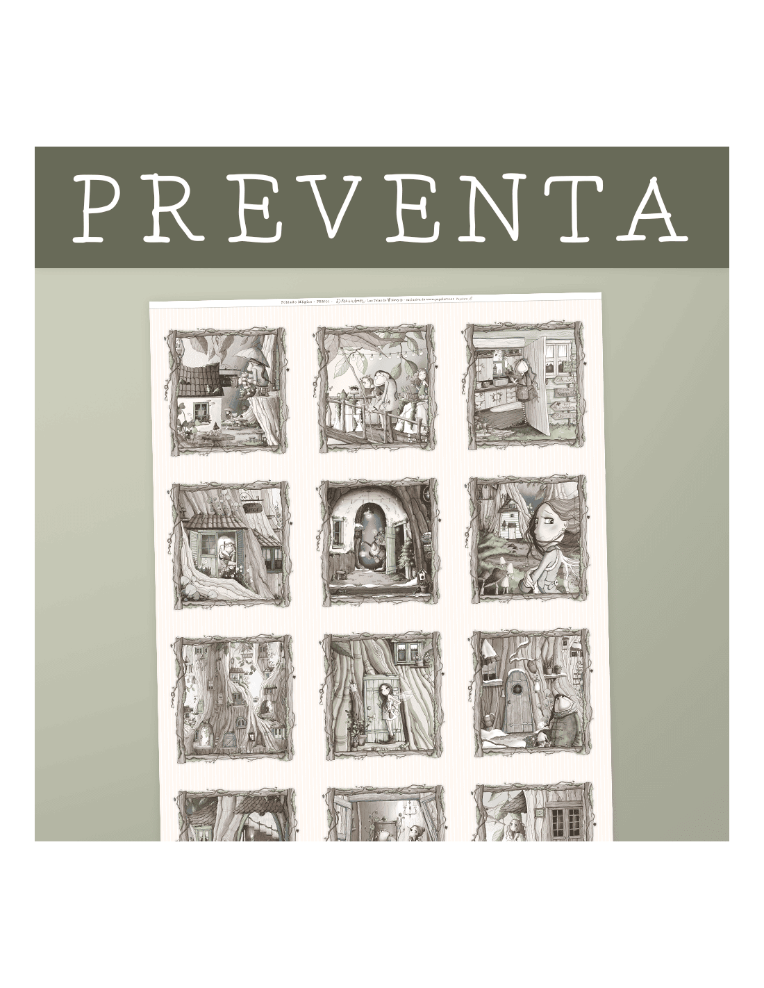 Panel con diferentes escenas del poblado mágico de El Altillo de los duendes. Echa un vistazo a cada rincón del poblado y conoce a sus mágicos habitantes.